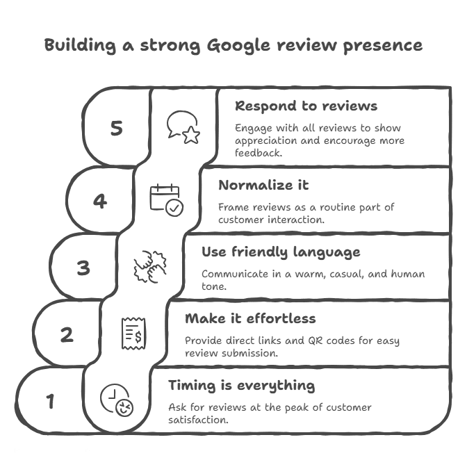 Avoid robotic or corporate-sounding requests. People respond better when it feels like a real person talking to another real person. Instead of: “Please leave us a Google review to support our business.” Try: “If you have a minute, we’d love to hear your thoughts on Google – it really helps small businesses like ours.” Warm, casual, and honest beats formal every time.